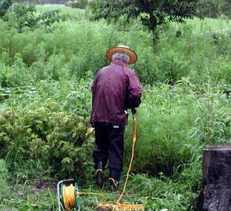 雨のなか合羽を着てムキになって草と格闘している後ろ姿は章ちゃん