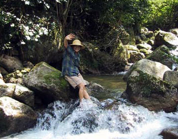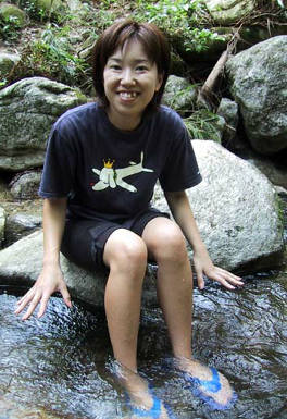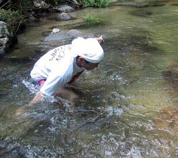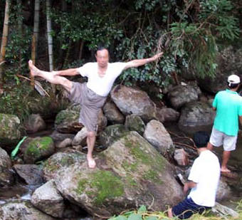 渓流の石の上で新体操か?
