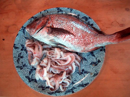 生簀に泳いでいた鯛と烏賊