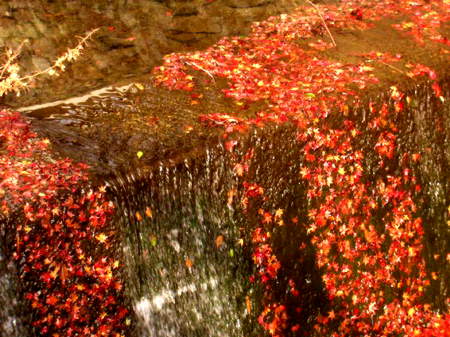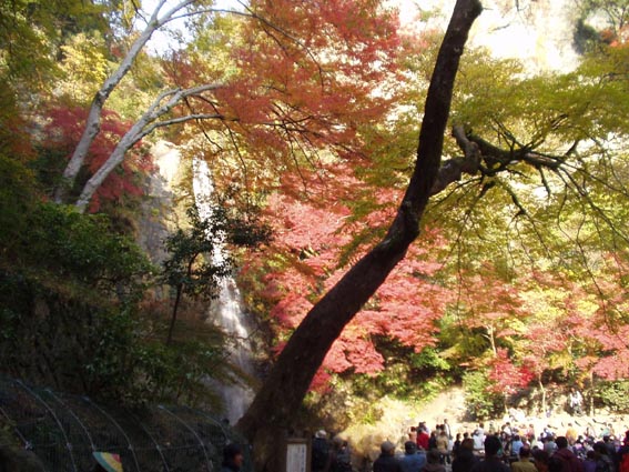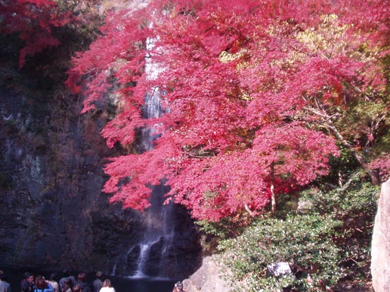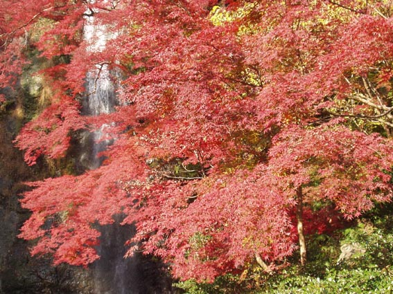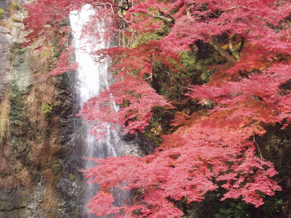 高さ33メ−トルの滝、光の加減でもみじの色が変わる。