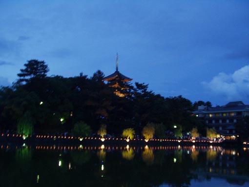 昼間の猿沢の池と夜の姿、上に興福寺の五重塔が見えます。
