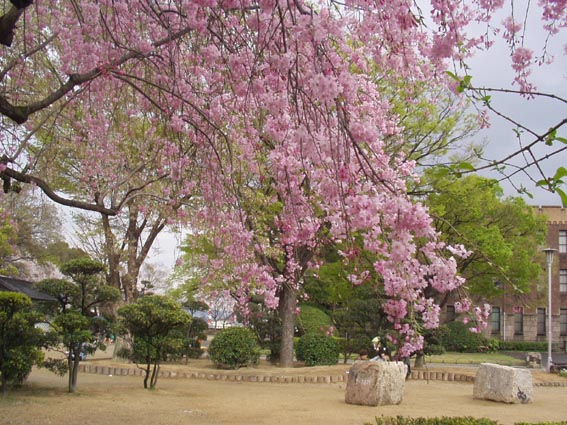 この庭園から天守閣を桜越しに見るのが良い、と新聞にあった。