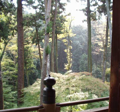 7. 本堂(これも国宝)から見る外の木立、まだ紅葉していない。