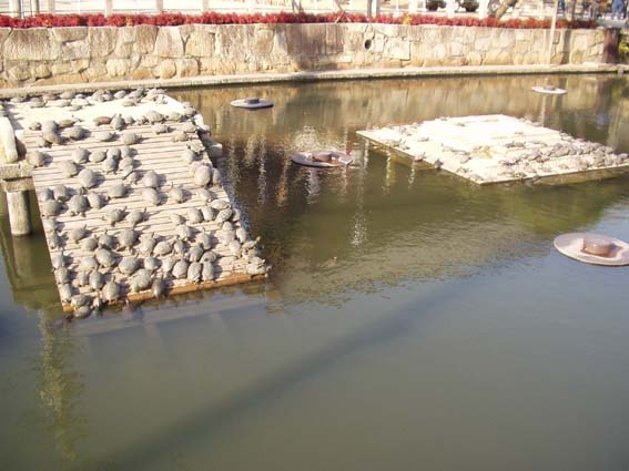 7.8. 祭事が行われる石舞台横の池では亀が甲羅干し。