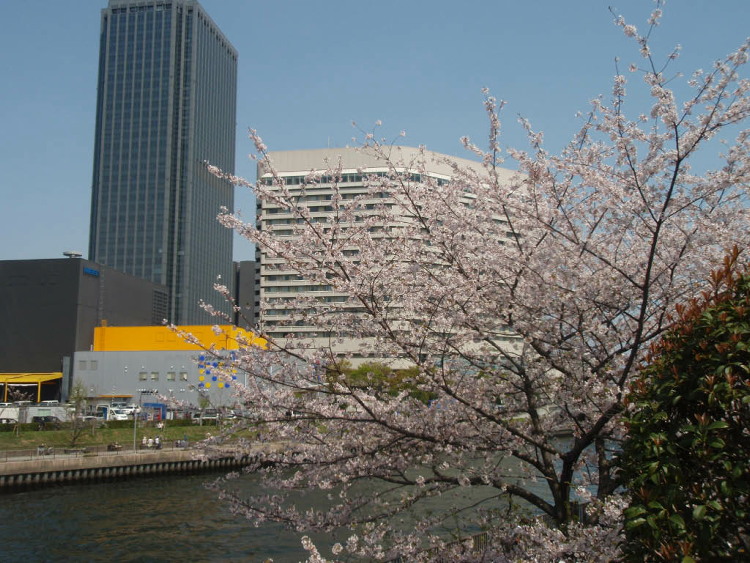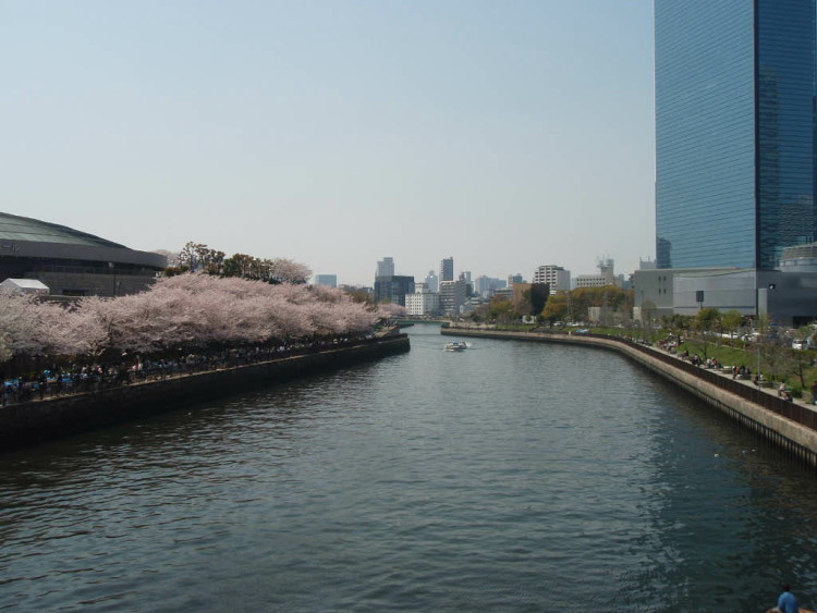 水上バスに乗れば、あの先土佐堀川を巡ってぐるりと約1時間花見ができます。