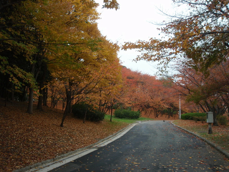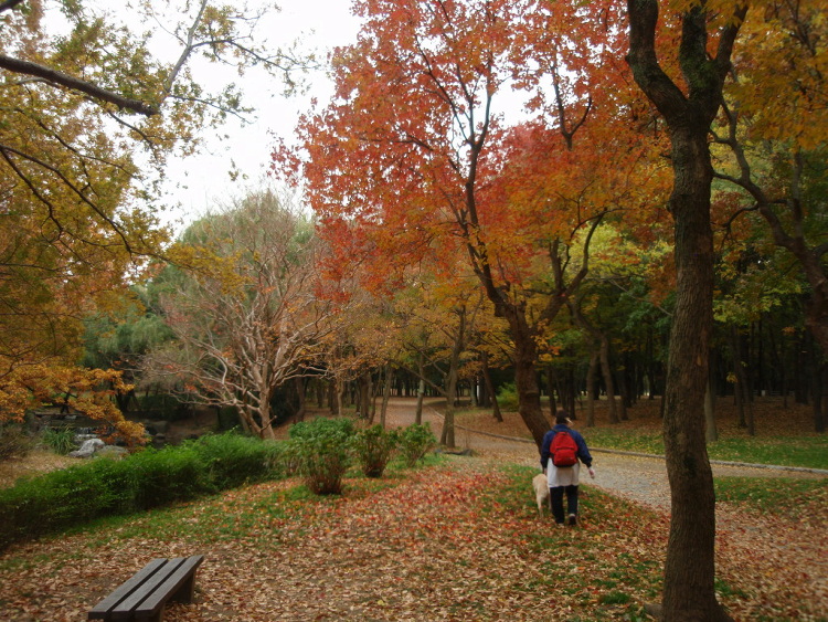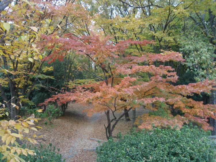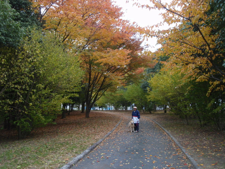 ようやく色づいた緑地は、気持ちよい散歩道となっています。
