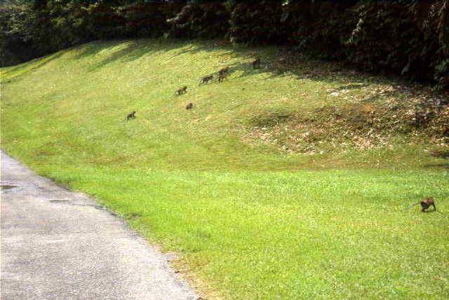 大家族が横断。10数匹は いました。渡り切るまでの3分間、ゴルフは