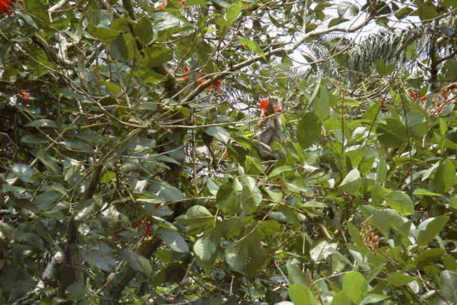 中断でお猿さんの見物。 渡った後は木に登って、赤い花を食べていました。