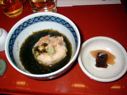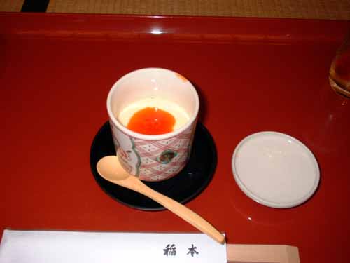 鱈の白子を豆乳と卵で蒸し固めズワイ蟹の内子をのせます
