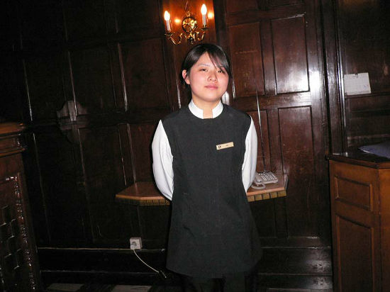 係りの小姐(シャオチェ)。バックの家具の古いこと!