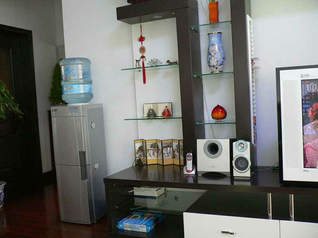 居間。ソファーから撮ったもの。左のポリタンクは飲用水。中国では水道の水は飲めない