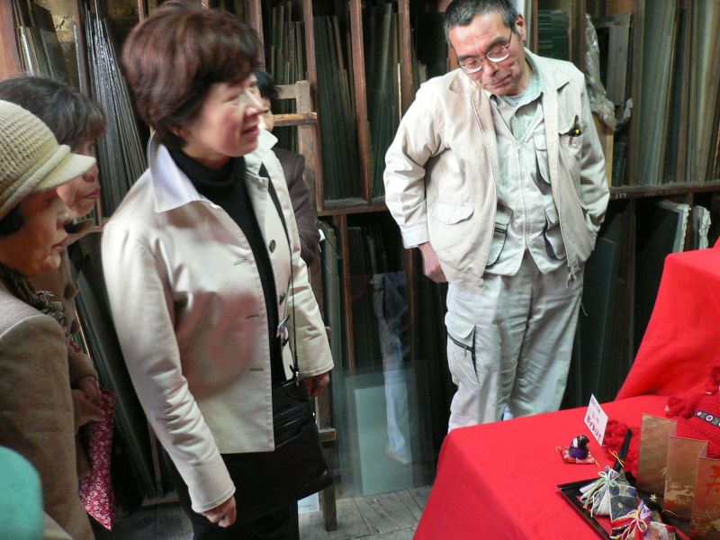 左下の三面人形を説明している店主の坂元さん